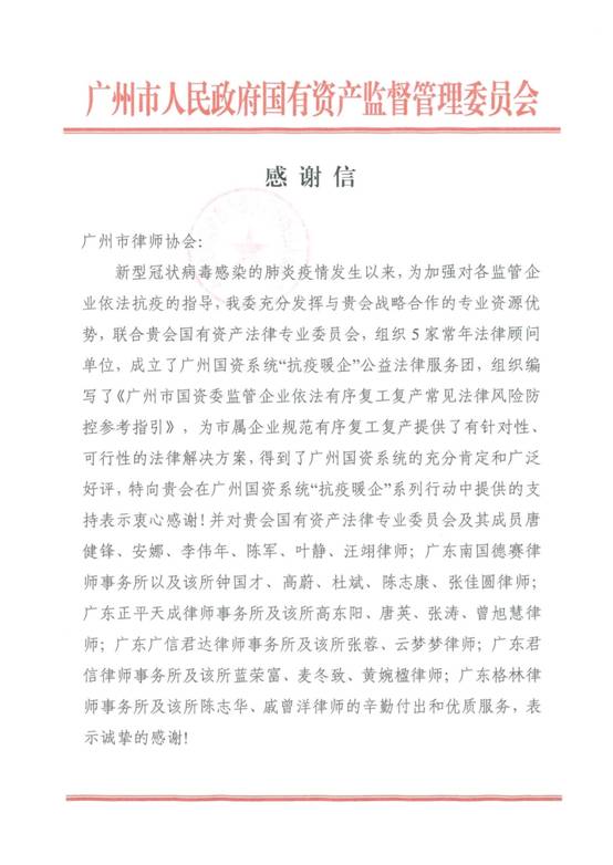 服務(wù):充分發(fā)揮專業(yè)優(yōu)勢,助力復(fù)工復(fù)產(chǎn)。紡織公司汪翊律師作為廣州市律師協(xié)會國有資產(chǎn)法律專業(yè)委員會的成員之一,積極投身廣州國資系統(tǒng)“抗疫暖企”公益法律服務(wù)團(tuán),參與編寫了《廣州市國資委監(jiān)管企業(yè)依法有序復(fù)工復(fù)產(chǎn)常見法律風(fēng)險(xiǎn)防控參考指引》, 并得到廣州市國資委的誠摯感謝。
